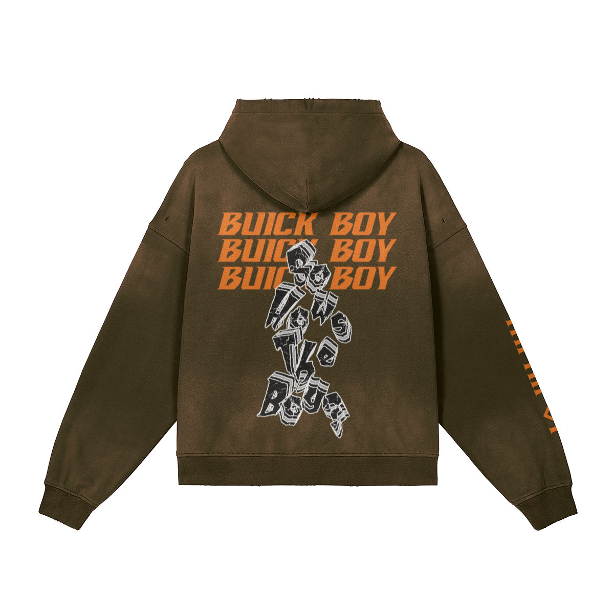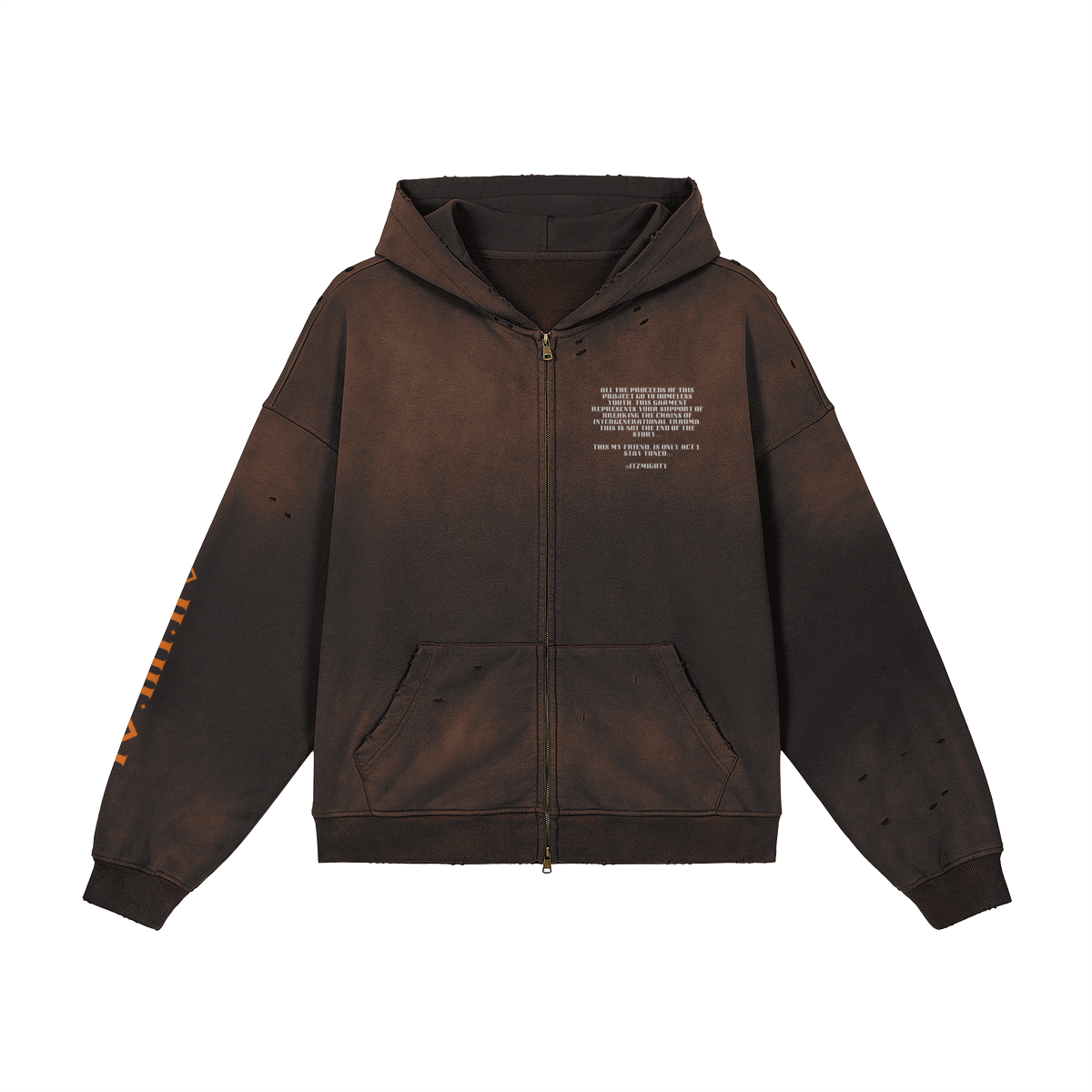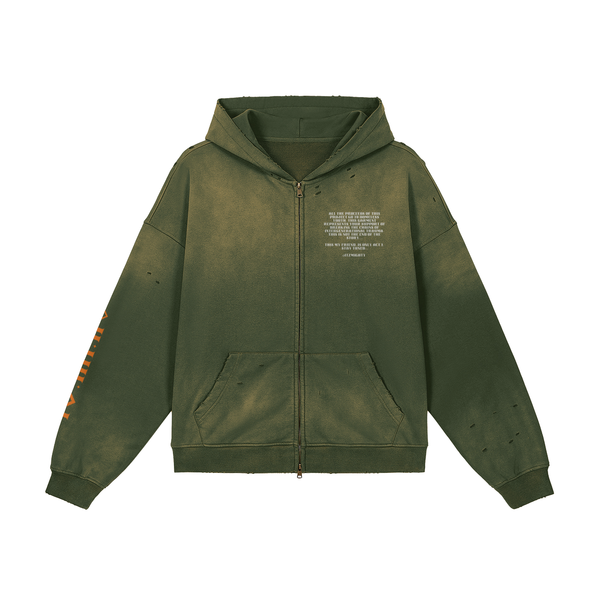 Crafted in 100% cotton, this unisex sun-faded distressed full-zip hoodie channels a vintage streetwear vibe. The sprayed fade wash and subtle worn-in details create a grunge-inspired look, perfect for oversized layering, casual outfits, or statement street style that blends comfort with a bold, lived-in edge.